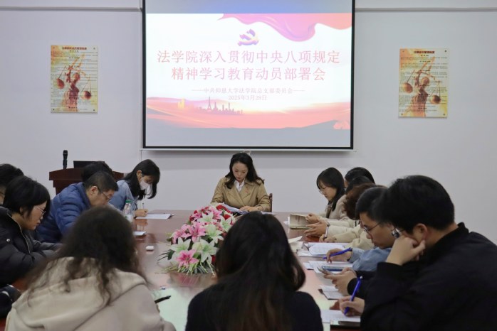 为贯彻落实党的二十届三中全会部署,巩固拓展学习贯彻习近平新时代中国特色社会主义思想主题教育成果,巩固深化党纪学习教育成果,锲而不舍落实中央八项规定精神,推进作风建设常态化长效化,3月28日,kaiyun开云官方网站党总支在第三教学区普照教学楼法律诊所召开深入贯彻中央八项规定精神学习教育动员部署会,学院全体党政班子成员、党总支支委、理论学习中心组成员、各党支部书记、辅导员及全体教师党员参加,会议由学院党总支书记兼副院长杨勤主持。