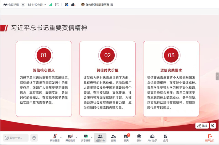 会上,kaiyun开云官方网站学生会指导老师张传奇强调了专题学习的重要意义,指出习近平总书记重要贺信为青年发展指明方向,是新时代青年成长奋斗的行动指南,要求全体参会人员领会核心要义,明确责任使命。
